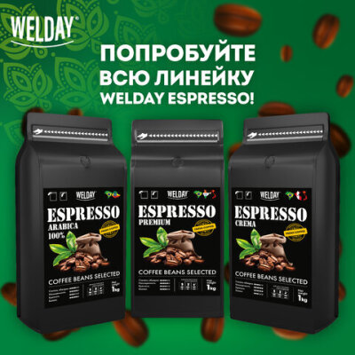 Кофе жареный в зернах WELDAY ESPRESSO – это насыщенный живой вкус из 100% арабики. Его мягкий сбалансированный купаж подойдет всем любителям кофе. Во вкусе ярко присутствуют нотки шоколада, жареного фундука и спелого зеленого яблока.