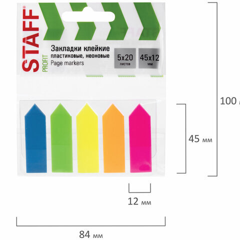 Закладки клейкие неоновые STAFF "СТРЕЛКИ", 45х12 мм, 100 штук (5 цветов х 20 листов), на пластиковом основании, 111355