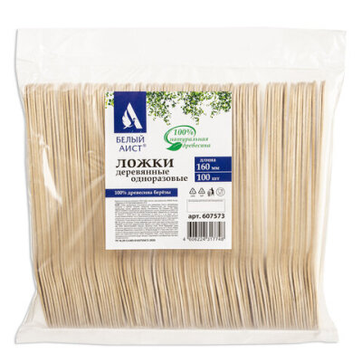 Ложка одноразовая деревянная 160 мм, КОМПЛЕКТ 100 шт., БЕЛЫЙ АИСТ, 607573, 61