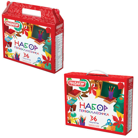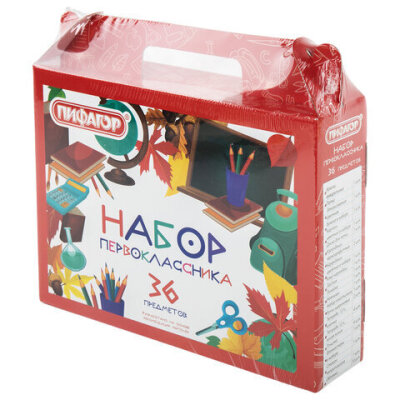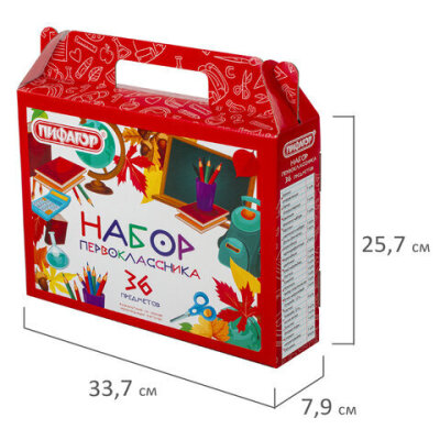 Набор школьных принадлежностей в подарочной коробке ПИФАГОР "НАБОР ПЕРВОКЛАССНИКА", 36 предметов, 880121