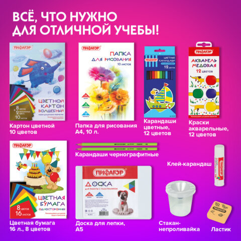 Набор канцелярских принадлежностей ПИФАГОР "ПЕРВОКЛАССНИК" для выпускников детского сада и первоклассников в красочной упаковке. Скомплектован на основе рекомендаций учителей начальных классов.
