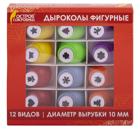 Дыроколы фигурные, НАБОР 12 видов, диаметр вырубки 10 мм, ОСТРОВ СОКРОВИЩ, 665226