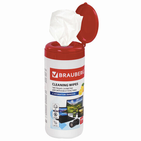 Салфетки для экранов всех типов и пластика BRAUBERG с ароматом "ЛИМОН", туба 100 шт., влажные, 511688