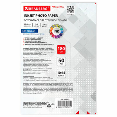Фотобумага глянцевая, 10х15 см, 180 г/м2, односторонняя, 50 листов, BRAUBERG ORIGINAL, 364009