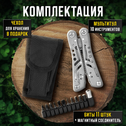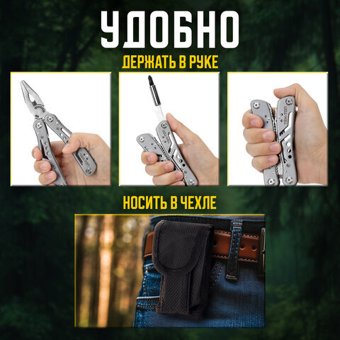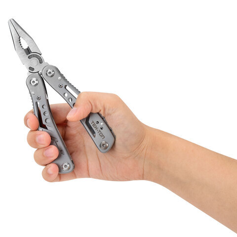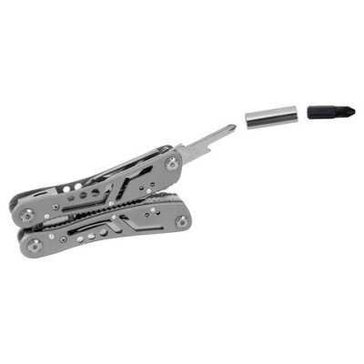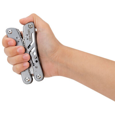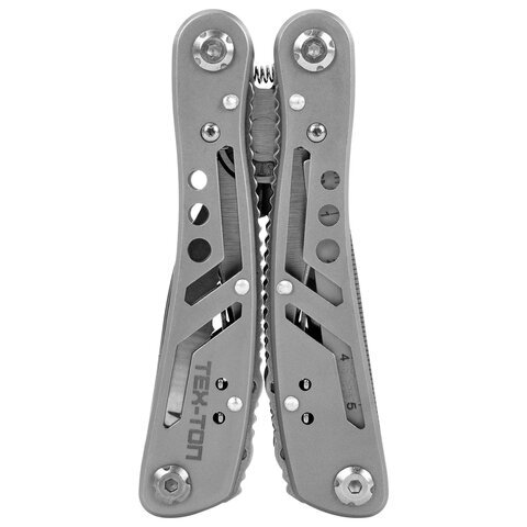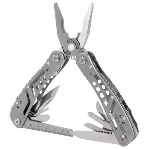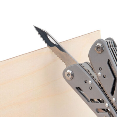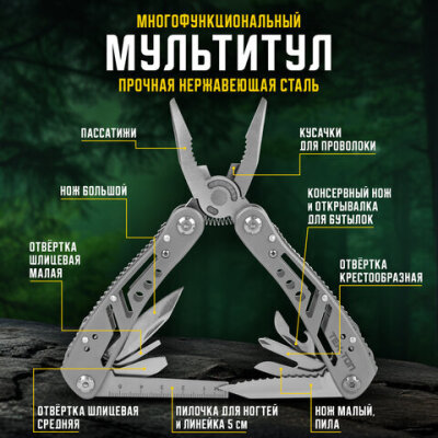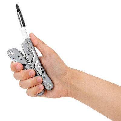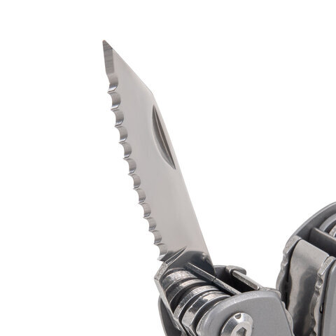 | Функционал | консервный нож/открывалка, кусачки для проволоки, нож большой, нож маленький, отвёртка крестообразная, отвёртка шлицевая маленькая, отвёртка шлицевая средняя, пассатижи, пила, пилочка для ногтей, рулетка 5 см |