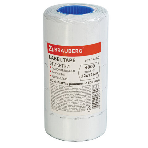 Этикет-лента 22х12 мм, волна, белая, комплект 5 рулонов по 800 шт., BRAUBERG, 123572