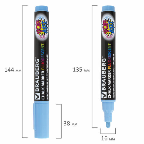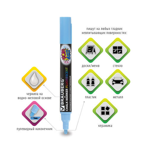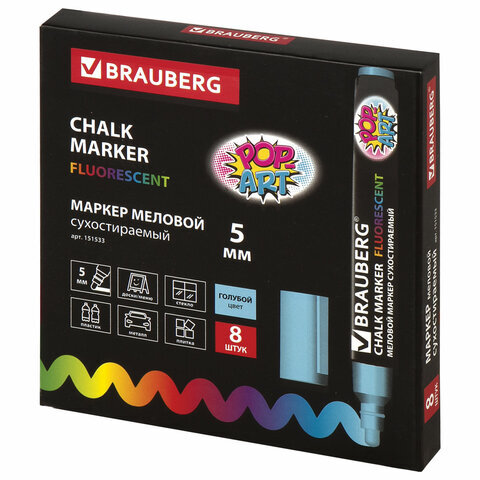 • Стираемый меловой маркер BRAUBERG "POP-ART" - оригинальный инструмент для оформления различных зон помещений. Идеален для использования на школьных занятиях и детского творчества.