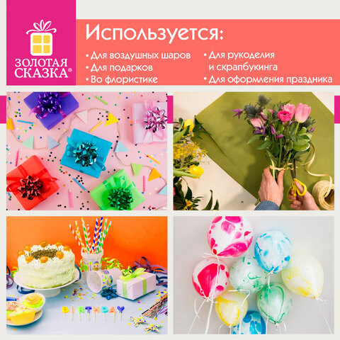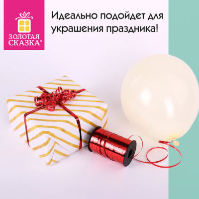 Лента упаковочная декоративная ЗОЛОТАЯ СКАЗКА предназначена для завязывания воздушных шаров и гирлянд, для декорирования подарков, для оформления праздничных композиций, кондитерских наборов. Лента также широко используется во флористике и в рукоделии.