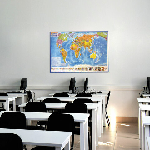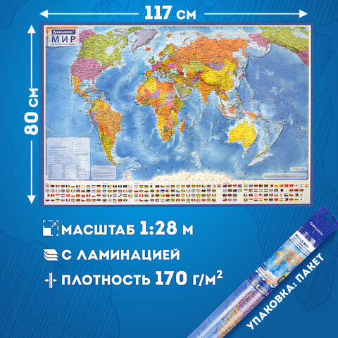Карта мира политическая 117х80 см, 1:28М, с ламинацией, интерактивная, европодвес, BRAUBERG, 112384