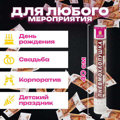 Пневматическая хлопушка ЗОЛОТАЯ СКАЗКА предназначена для создания отличного настроения и атмосферы настоящего веселья на любом празднике - новогодней вечеринке, торжестве в честь Дня Рождения, выпускном, корпоративе или любом другом праздничном событии.