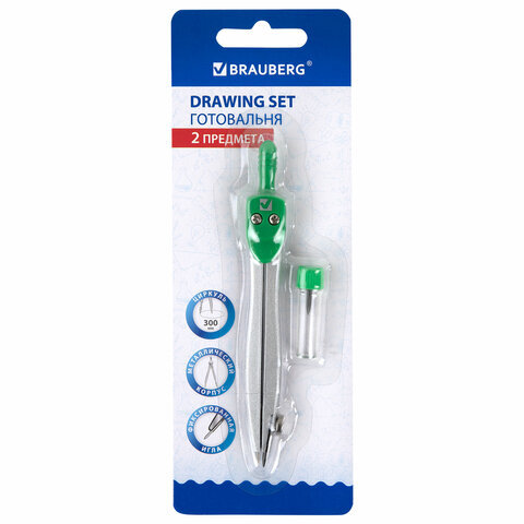Металлическая готовальня BRAUBERG "Klasse" предназначена для выполнения чертежных работ. Для учеников младших и средних классов.