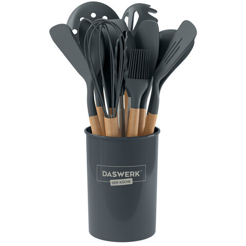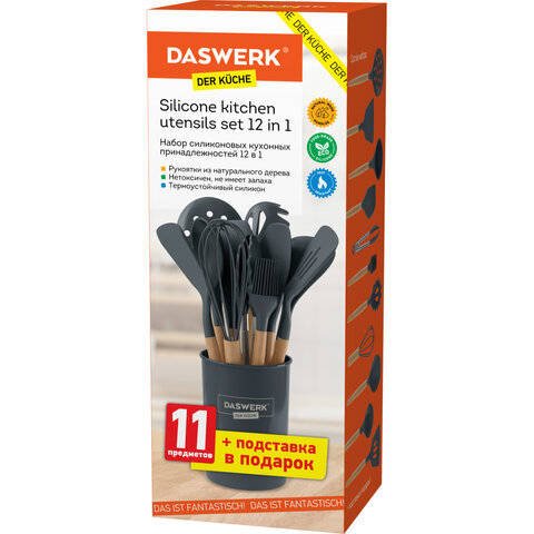 • Стильный и функциональный набор силиконовых кухонных принадлежностей DASWERK с подставкой. Станет незаменимым помощником для всех, кто умеет и любит готовить.