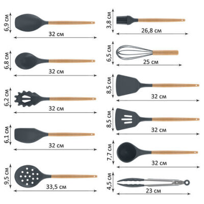 Состав набора лопатка для жарки, шпатель, венчик, щипцы, плоская ложка для выпечки, лопатка с отверстиями для слива масла, половник, ложка для салата, кисточка для масла, ложка для спагетти и шумовка