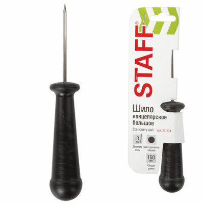 Шило канцелярское большое STAFF, общая длина 150 мм, диаметр иглы 3 мм, ручка черная, 237174