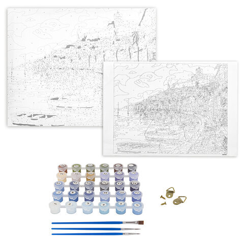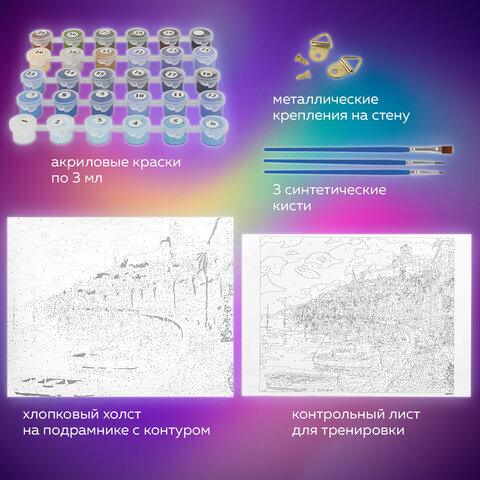 | Комплектация | акриловые краски, кисть, крепеж, лист бумаги для тренировки, холст на подрамнике |