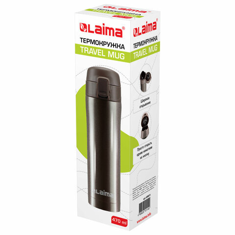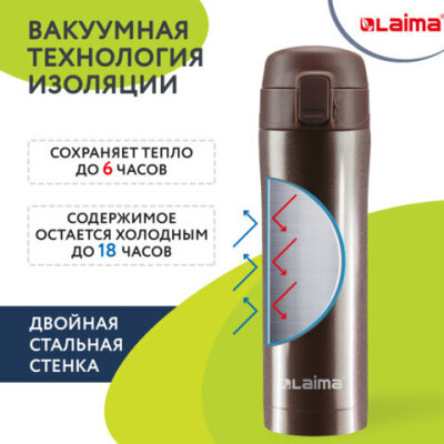 Термокружка LAIMA с двойной стальной стенкой изготовлена из нержавеющей стали марки 304 медицинского уровня. Сконструирована по вакуумной технологии.