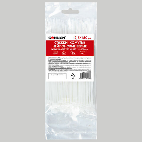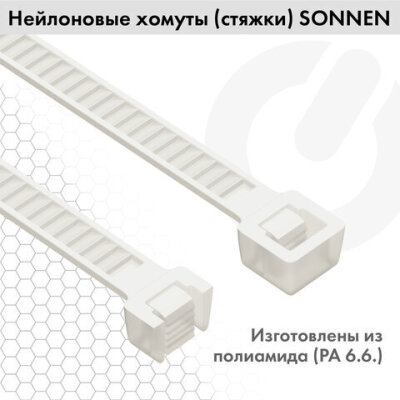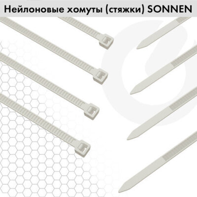 Стяжки (хомуты) нейлоновые SONNEN используются при проведении электромонтажных работ для крепления кабелей, проводов и других предметов к несущей поверхности или для соединения между собой. Такие стяжки также используются для бытовых и хозяйственных нужд.