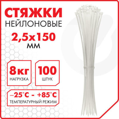 Стяжка (хомут) нейлоновая сверхпрочная POWER LOCK, 2,5х150 мм, КОМПЛЕКТ 100 шт., белая, SONNEN, 607919
