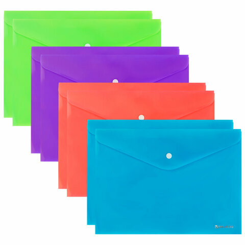 Папка-конверт с кнопкой А4, КОМПЛЕКТ 8 шт., яркие неоновые цвета ассорти, BRAUBERG "NEON", 272871