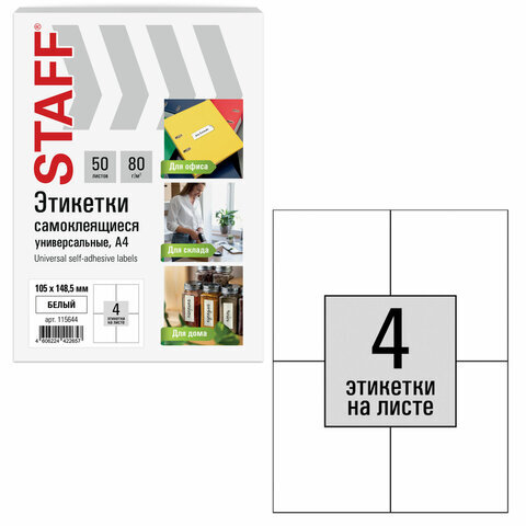 Этикетка самоклеящаяся 105х148,5 мм, 4 этикетки, белая, 80 г/м2, 50 листов, STAFF BASIC, 115644