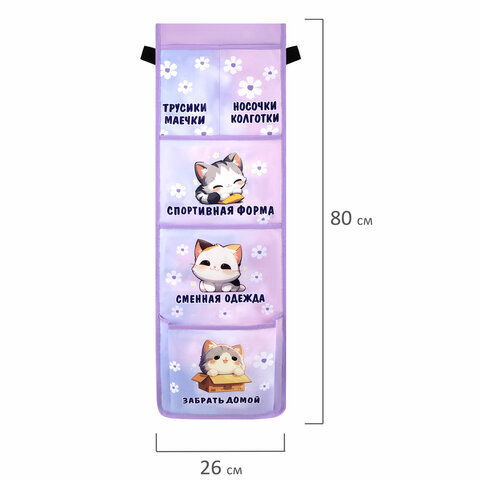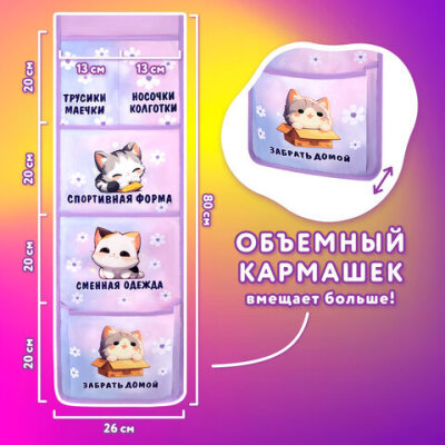 Кармашки-органайзер в шкафчик для детского сада ЮНЛАНДИЯ, увеличенный размер, 26х80 см, "Sleepy kitty", 273281