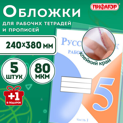 Обложки ПП для рабочих тетрадей и прописей, НАБОР "5 шт. + 1 шт. в ПОДАРОК", 240х380 мм, 80 мкм, универсальные, прозрачные, ПИФАГОР, 272710
