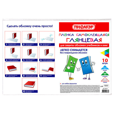Пленка самоклеящаяся для учебников и книг 50х36 см, КОМПЛЕКТ 10 шт., глянцевая, ПИФАГОР, 224317