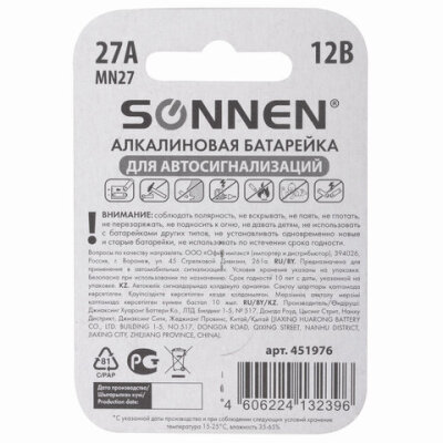 Батарейка SONNEN Alkaline, 27А (MN27), алкалиновая, для сигнализаций, 1 шт., в блистере, 451976