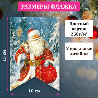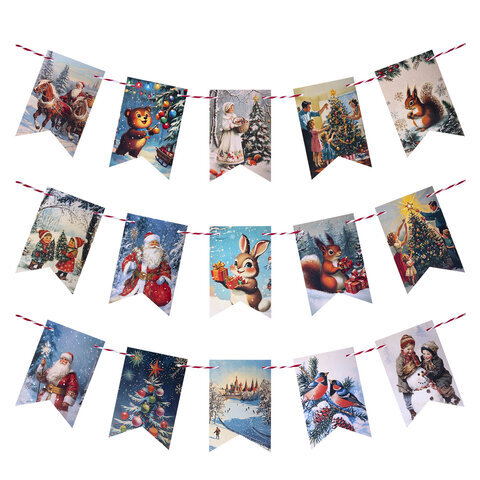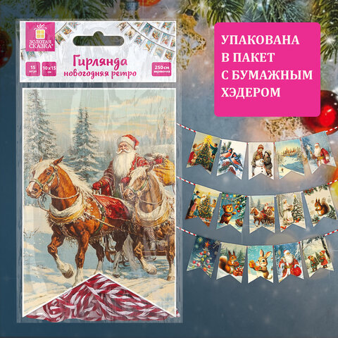 Гирлянда новогодняя "Ретро", 15 флажков, 10х15 см, картон, 2,5 м жгут, ЗОЛОТАЯ СКАЗКА, 592585
