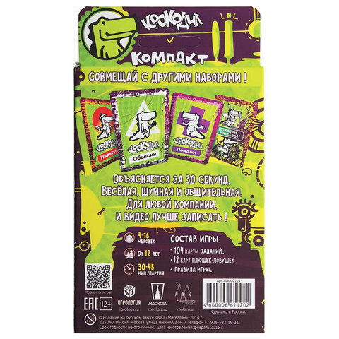 Увлекательная командная игра "Крокодил" выпущена в компактном походном варианте и имеет огромное количество заданий на абсолютно разные темы. Веселая игра разовьет воображение и смекалку, поддержит командный дух и обеспечит приятное времяпрепровождение.