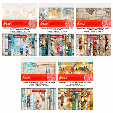 Бумага для скрапбукинга 15х21 см, двусторонняя,12 листов, 240 г/м2, АССОРТИ, 5 дизайнов, ОСТРОВ СОКРОВИЩ, 665441