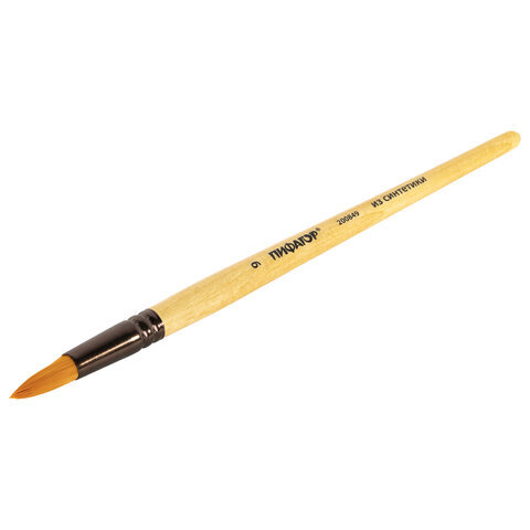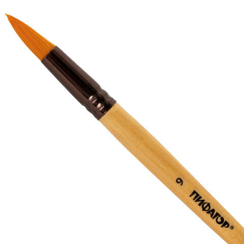 Кисть ПИФАГОР, СИНТЕТИКА, круглая, № 9, деревянная лакированная ручка, с колпачком, пакет с подвесом, 200849