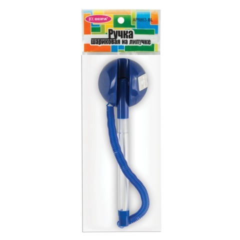 Настольная шариковая ручка на пружинке и на подставке с регулируемым углом наклона. Подставка легко фиксируется на любой ровной поверхности с помощью липучки.