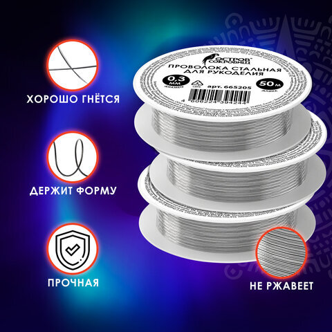 Проволока стальная для рукоделия, диаметр 0,3 мм, длина 50 м, ОСТРОВ СОКРОВИЩ, 665205