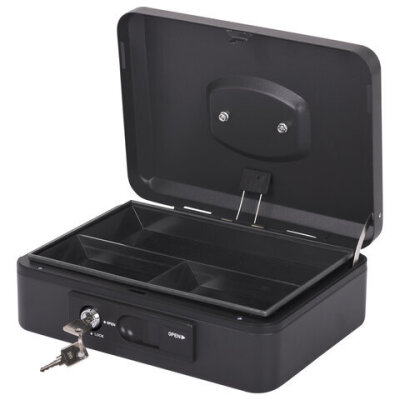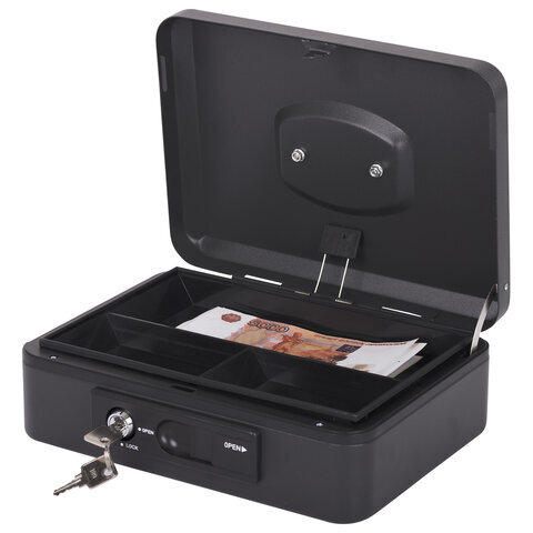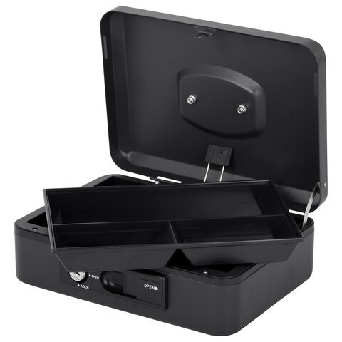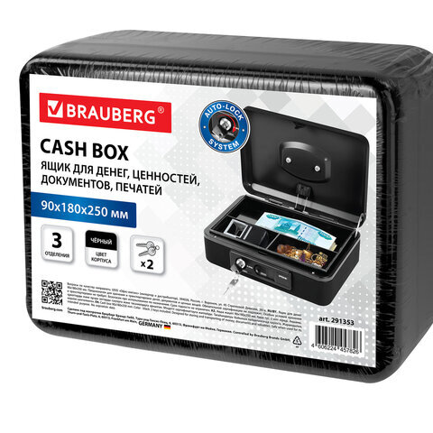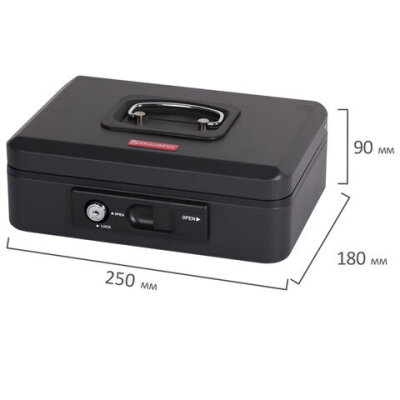 Ящик для денег, ценностей, документов, печатей, 90х180х250 мм, ключевой замок и автолок, черный, BRAUBERG, 291353