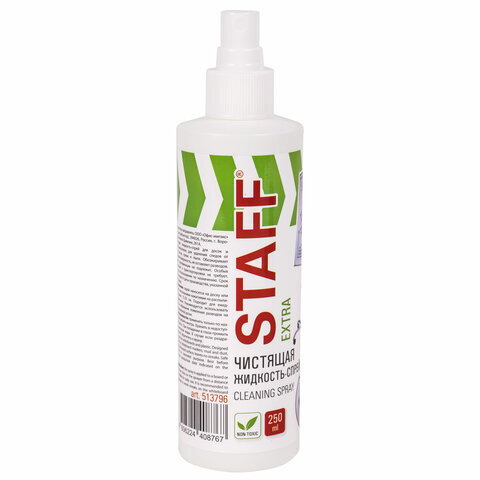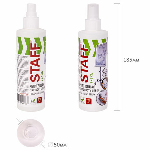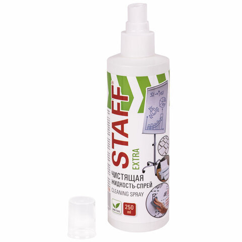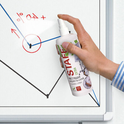 Чистящая жидкость-спрей STAFF "Extra" предназначена для удаления надписей и загрязнений с маркерных досок и пластиковых поверхностей.