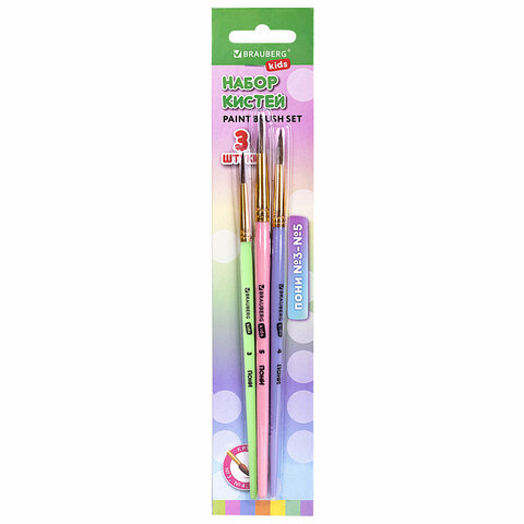 Кисти ПОНИ набор 3 шт. (круглые № 3, 4, 5), блистер, BRAUBERG KIDS, 201074