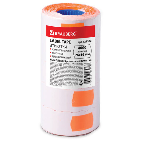 Этикет-лента 26х16 мм, волна, оранжевая, комплект 5 рулонов по 800 шт., BRAUBERG, 123582
