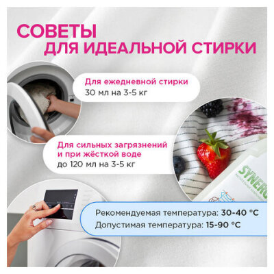 Особый состав средства для стирки SYNERGETIC обеспечивает деликатную стирку. Стирайте хлопок, синтетику, шерсть и смешанные материалы без переживаний за их долговечность (но не забудьте выбрать корректный режим стирки и добавить кондиционер).