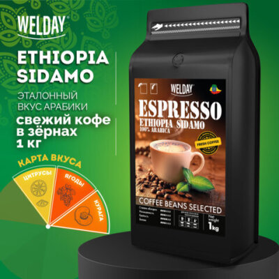 Кофе в зернах WELDAY (ВЭЛДЭЙ) "ESPRESSO ЭФИОПИЯ СИДАМО" 1 кг, арабика 100%, 624399