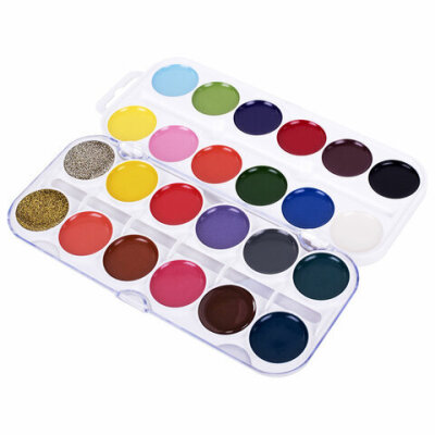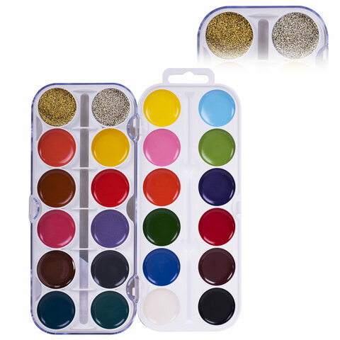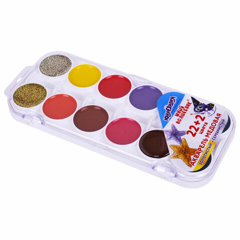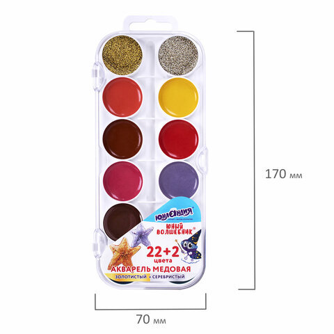 Краски акварельные ЮНЛАНДИЯ "ЮНЫЙ ВОЛШЕБНИК", медовые, 22+2 цвета (золото+серебро), круглые кюветы, пластик, 192361