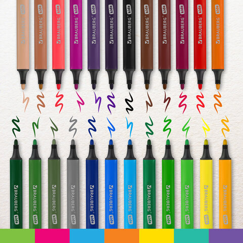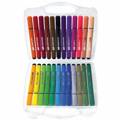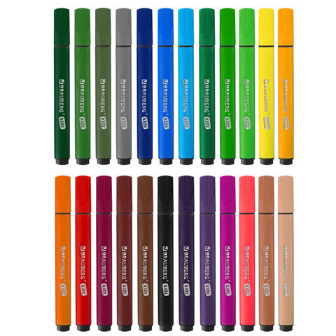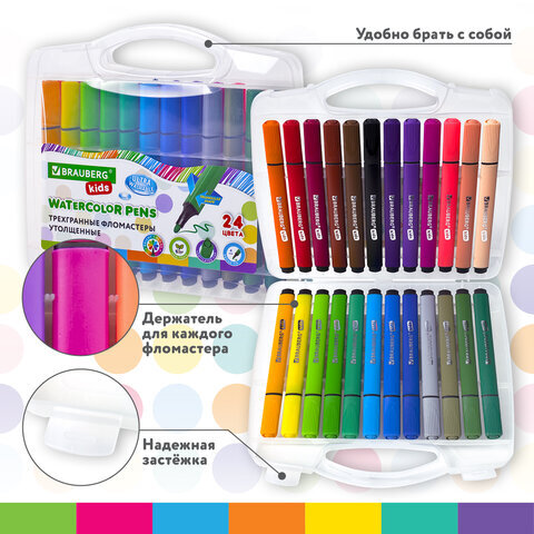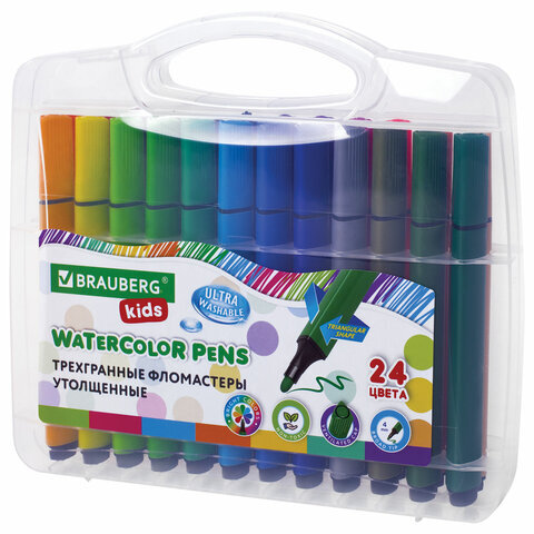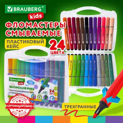 • Фломастеры BRAUBERG KIDS - набор из 24 утолщенных трехгранных фломастеров со смываемыми чернилами в пластиковом кейсе для рисования.