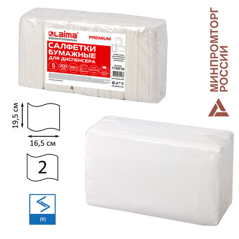 Салфетки косметические для диспенсера (Система N4) LAIMA PREMIUM, КОМПЛЕКТ 5 пачек по 200 шт., 2-слойные, 19,5х16,5 см, белые, 112510
