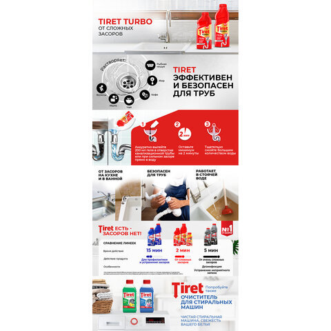 Густая структура геля TIRET Turbo позволяет продукту проникать глубоко в трубу даже при наличии воды в раковине. Убивает бактерии и устраняет неприятные запахи. Идеально подходит и безопасен для всех видов металлических и пластиковых труб.