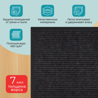 Коврик придверный 80х120 см, ЧЕРНЫЙ, влаго-грязезащитный, 450 г/м2, ребристый, PRIMILA (ПРИМИЛА) EXTRA, 701030