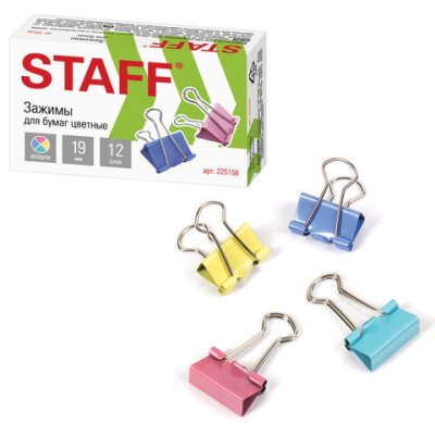 Зажимы для бумаг STAFF "Profit", КОМПЛЕКТ 12 шт., 19 мм, на 60 листов, цветные, картонная коробка, 225156