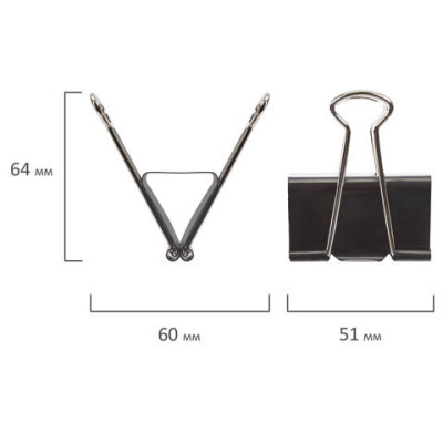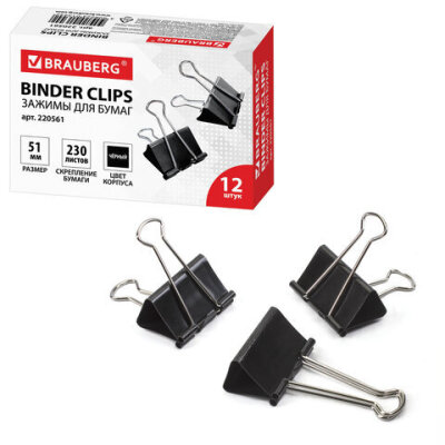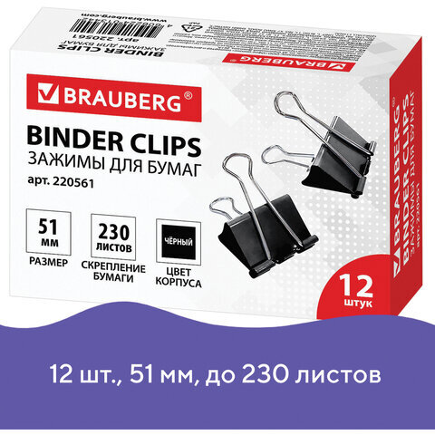 Зажимы для бумаг большие BRAUBERG, КОМПЛЕКТ 12 шт., 51 мм, на 230 листов, черные, картонная коробка, 220561