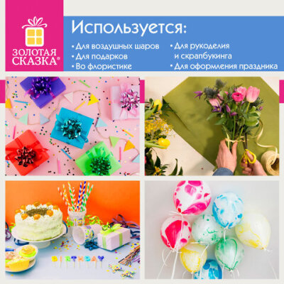 Лента упаковочная декоративная ЗОЛОТАЯ СКАЗКА предназначена для завязывания воздушных шаров и гирлянд, для декорирования подарков, для оформления праздничных композиций, кондитерских наборов. Лента также широко используется во флористике и в рукоделии.