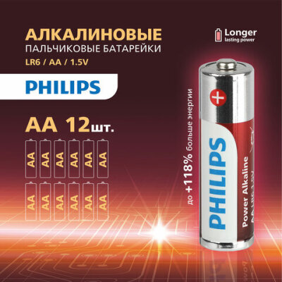 Батарейки алкалиновые "пальчиковые" КОМПЛЕКТ 12 шт., PHILIPS Power Alkaline, АА (LR6, 24А), блистер, Б0064661
