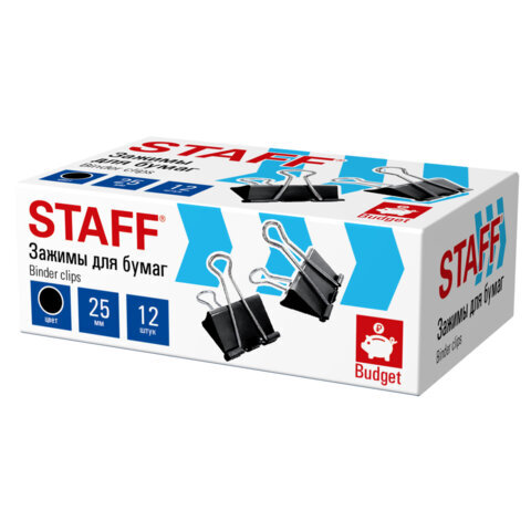 Зажимы для бумаг STAFF ECO, КОМПЛЕКТ 12 шт., 25 мм, на 100 листов, черные, картонная коробка, 274032